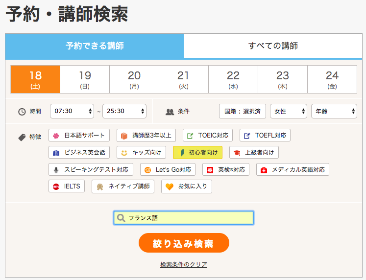 有料コースに登録してこれまで何度かレッスンを重ねてきましたが、キーワードを入力して先生を検索出来るので、なるべくフランス語も話せる先生を選ぶようにしています。