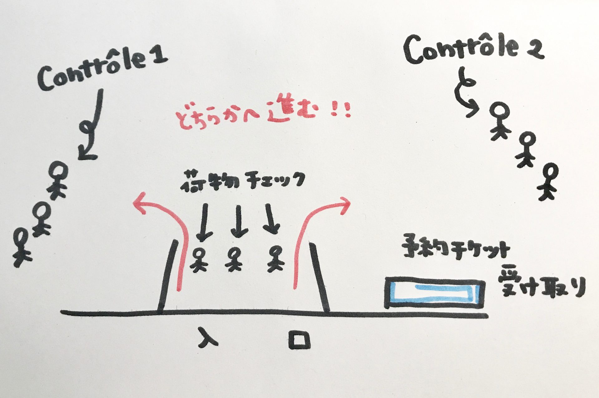 contrôle(コントロール)とは、検査や点検という意味があって、contrôle1と2の場所ではチケットに書いてあるバーコードを係りの人が読み取ってざっくり席を案内してくれます。