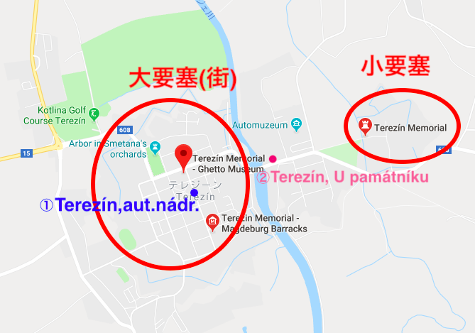 覚えておくとちょっと便利なのは、テレジーンのバス停は2つあるということ。