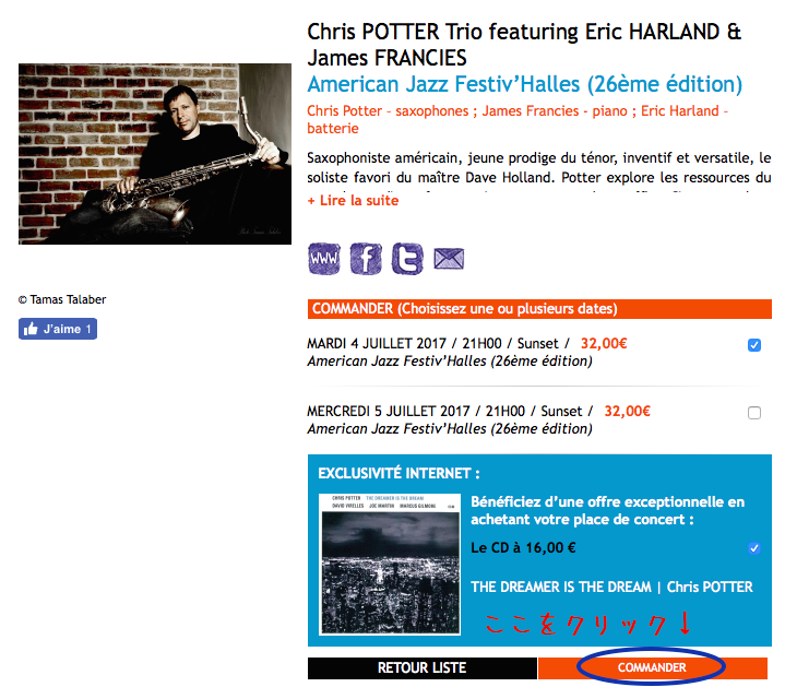 するとライブの詳細画面が出てくるので、メンバーや日付、値段などを確認し、右下の方にある『COMMANDER』をクリックします。