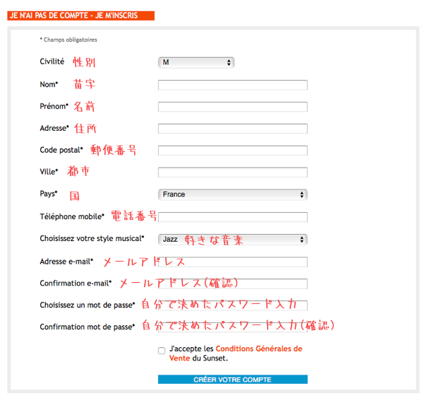 次に予約をする人についての情報を入力しなければならないのですが、まだ会員登録をしていない人は『JE N’AI PAS DE COMPTE – JE M’INSCRIS』というところに必要事項を記入していきましょう。