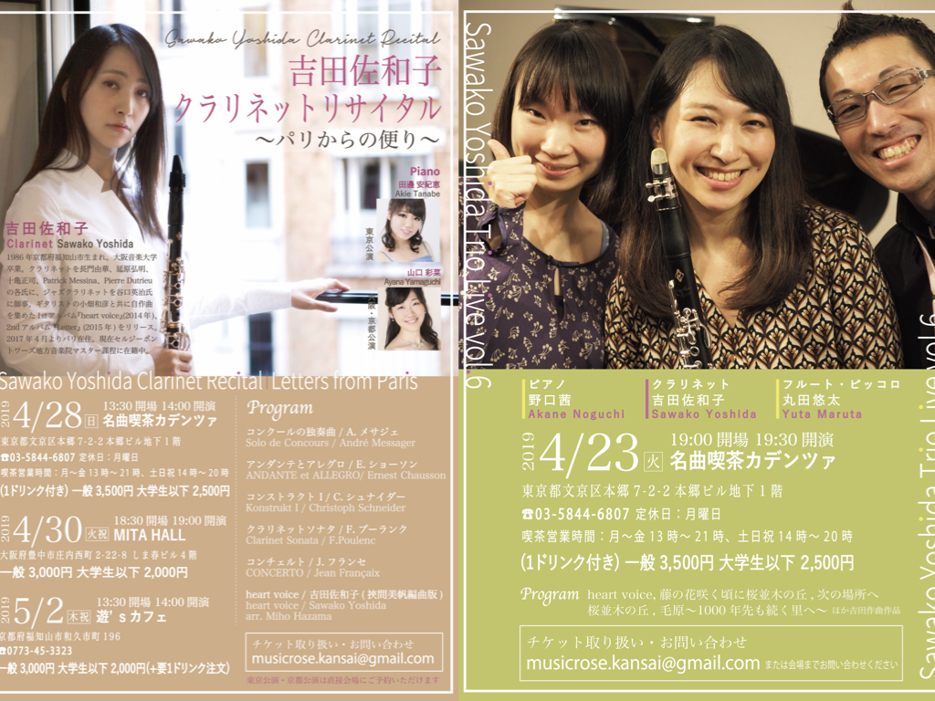 トリオライブが終わったあとは、人生初のクラリネットリサイタルを東京、大阪、京都(福知山)で行います。