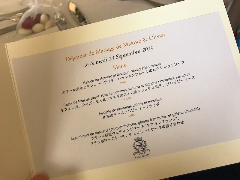 今回は日本人の新婦と日仏ハーフの新郎の結婚式だったこともあり、メニューはフランス語と日本語で書かれていました。