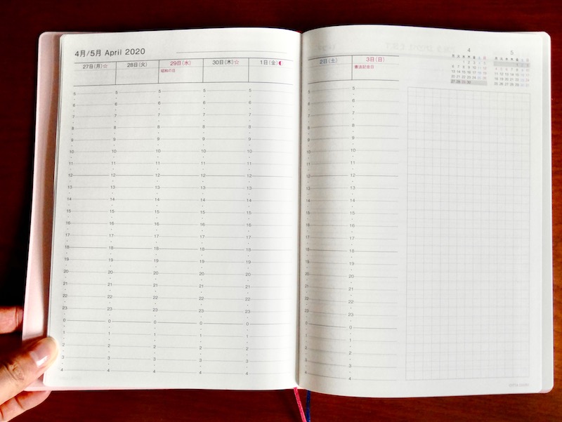 これまで使っていたほぼ日手帳は1日1ページ書くタイプなんですが、これだと1日1日を大切に送れるものの、見通しが立ちにくいのです。